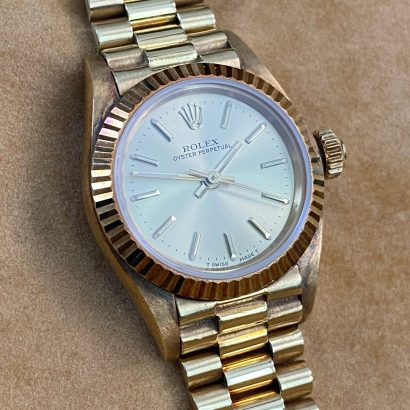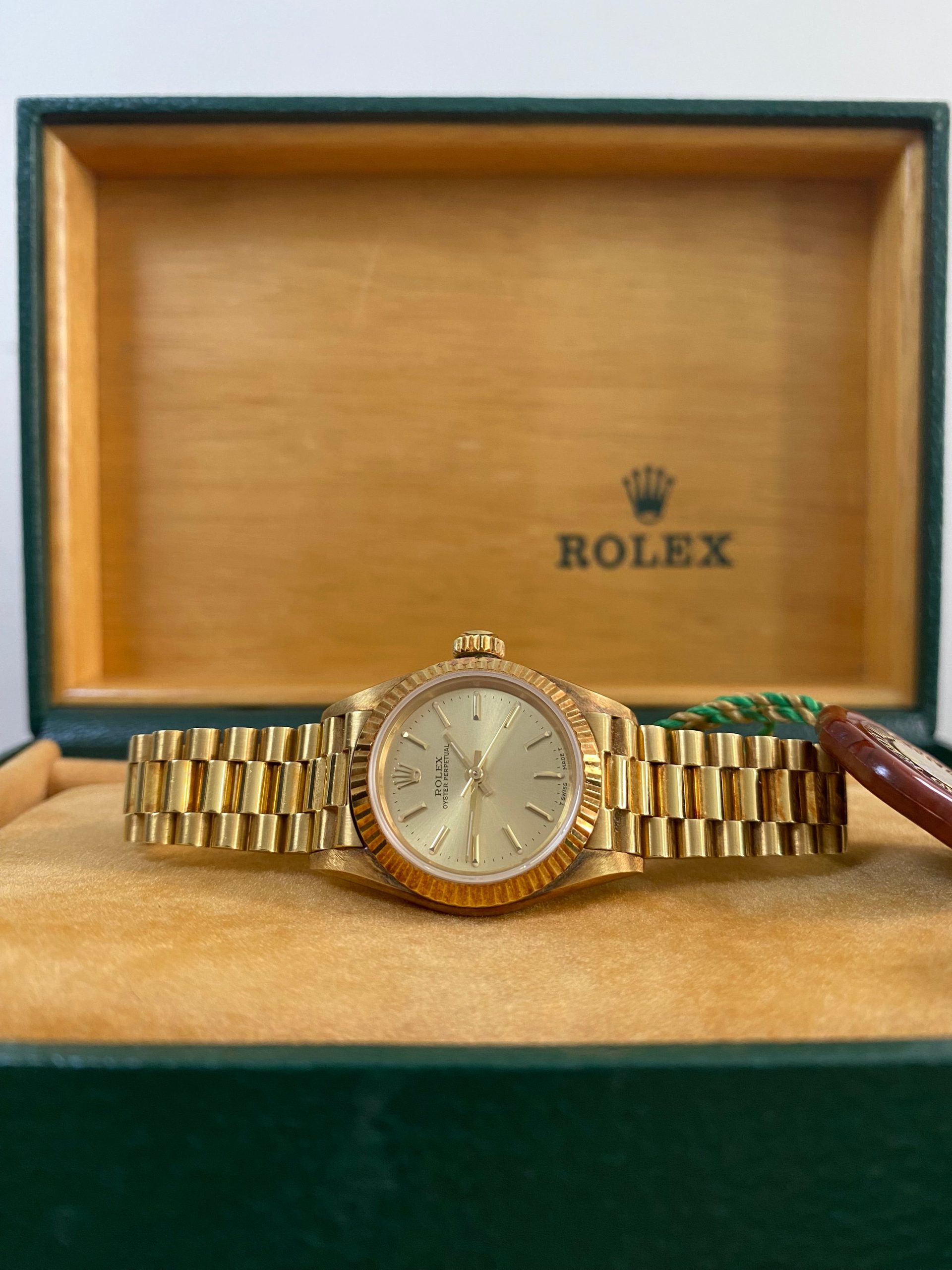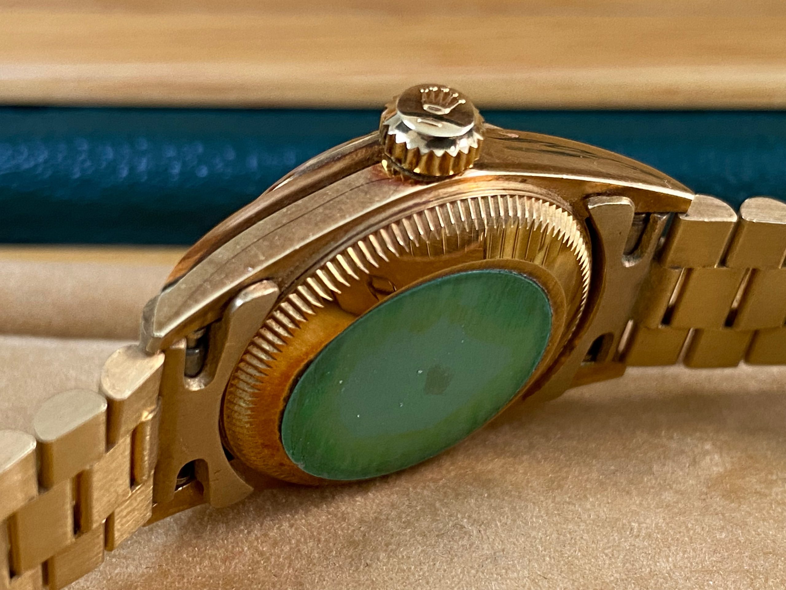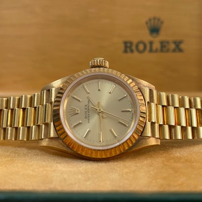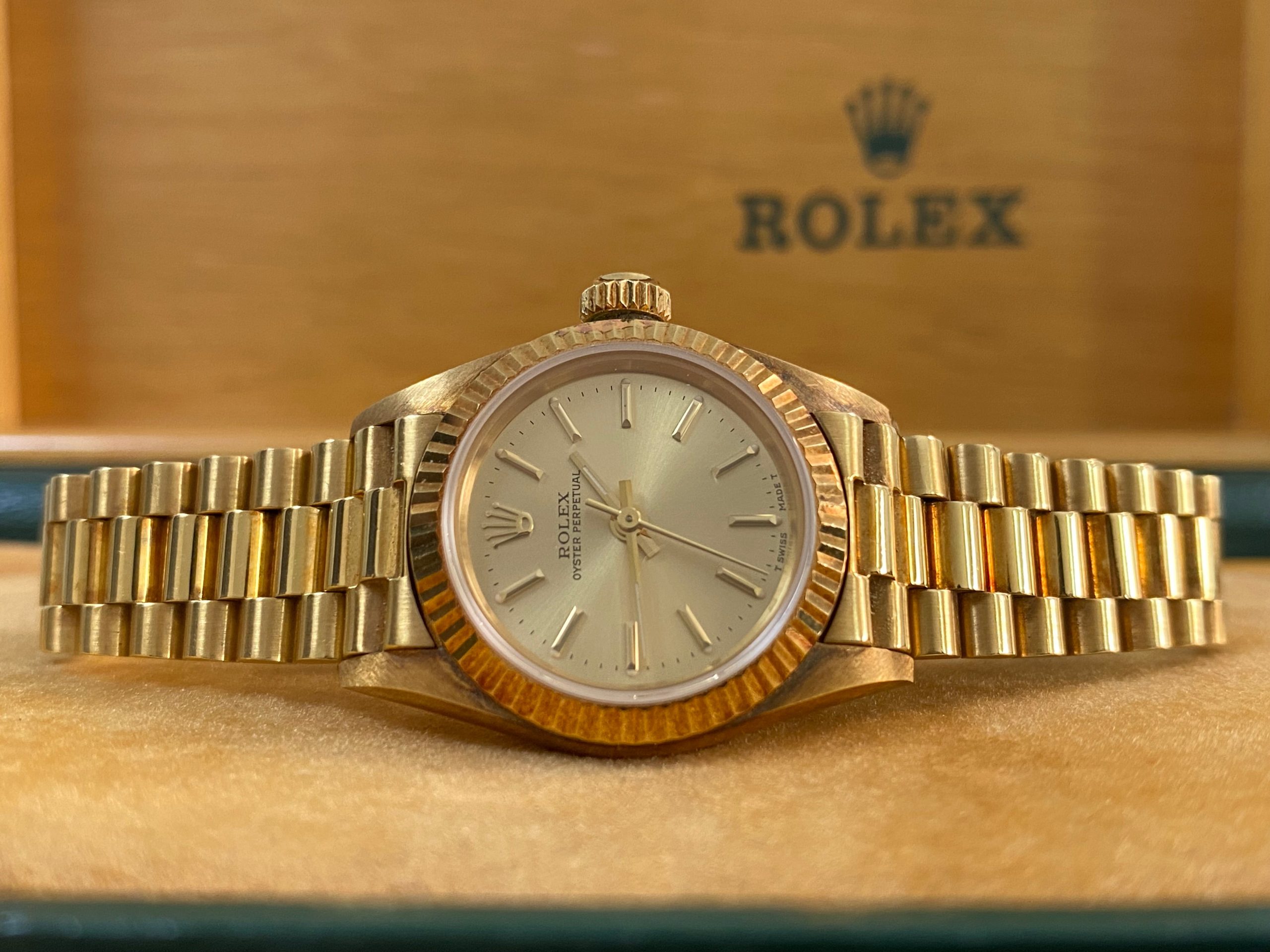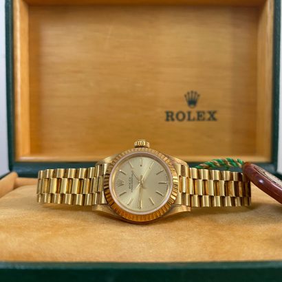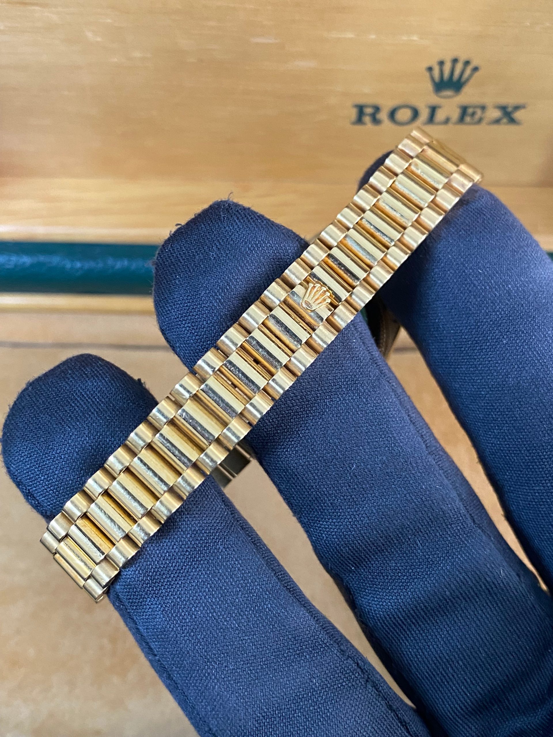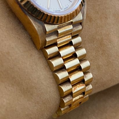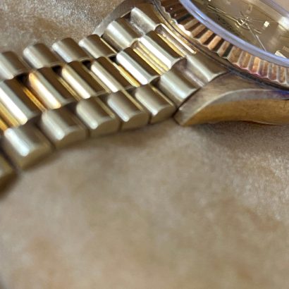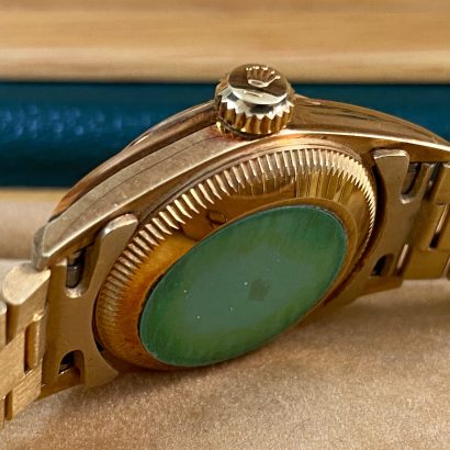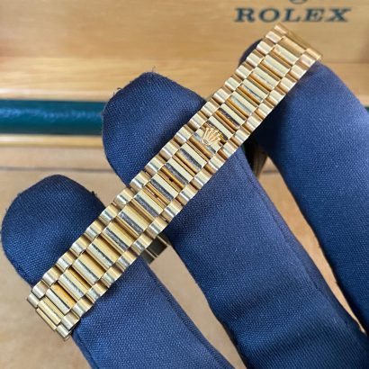 This watch is used but in mint condition, unpolished with intact caseback sticker, and will come with an original Rolex box when purchased. Considering its age, the president bracelet is in great shape with minimal signs of stretch as seen in the photo gallery. We provide a 1-year Warranty.
