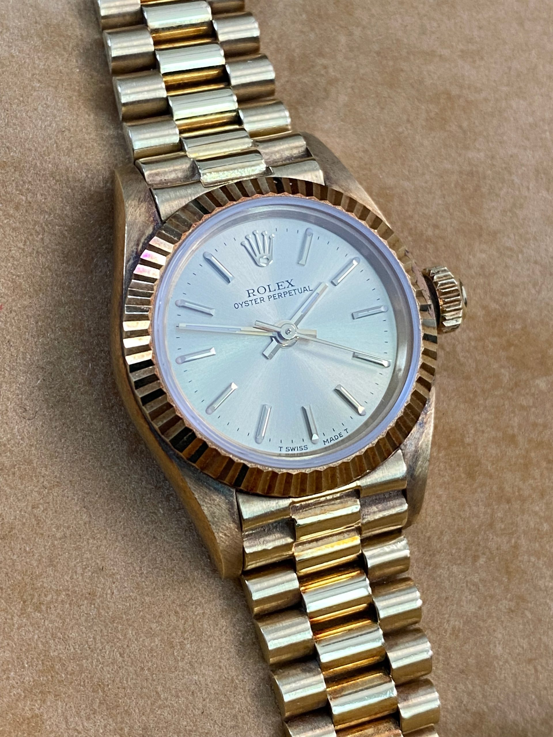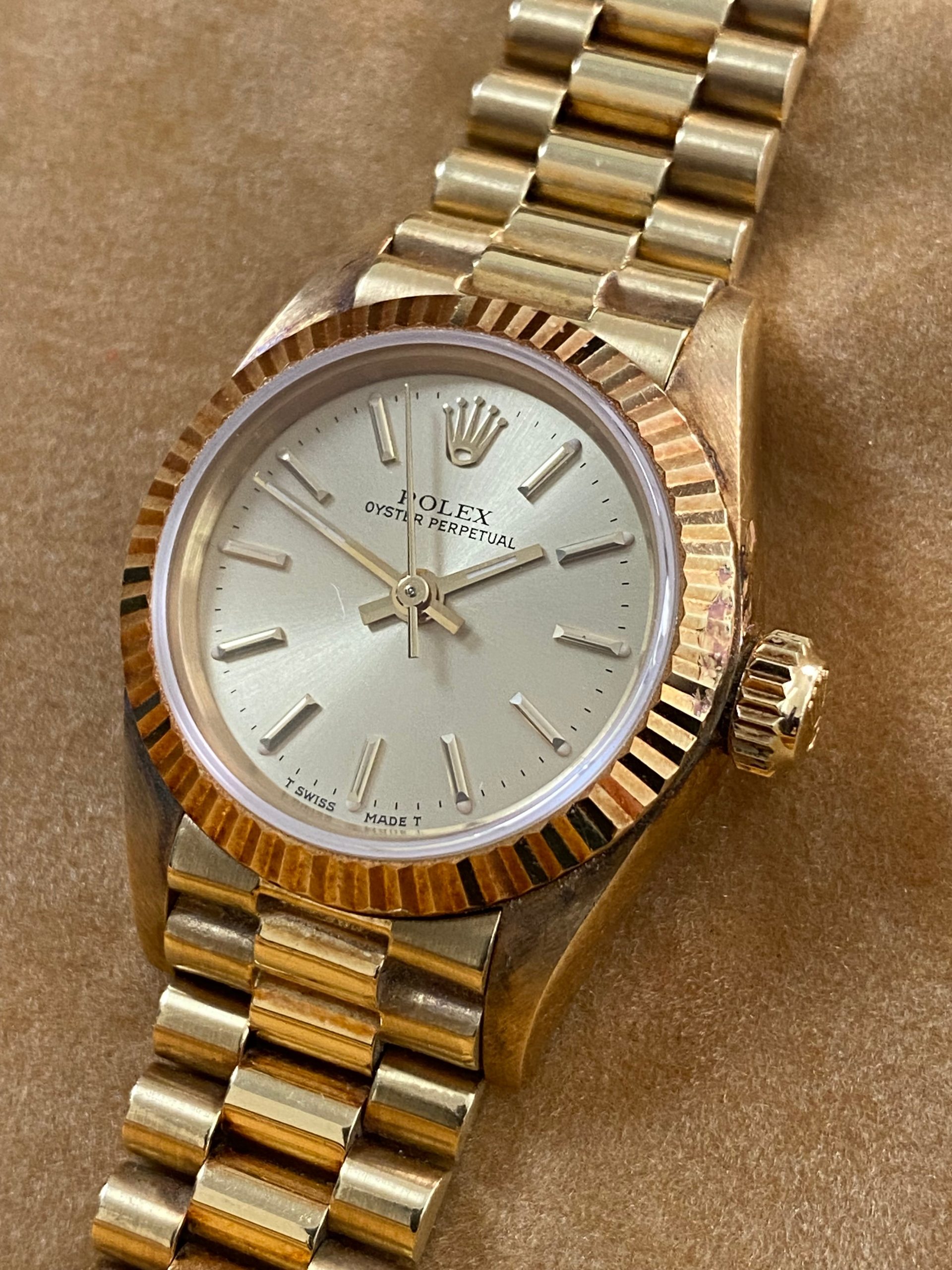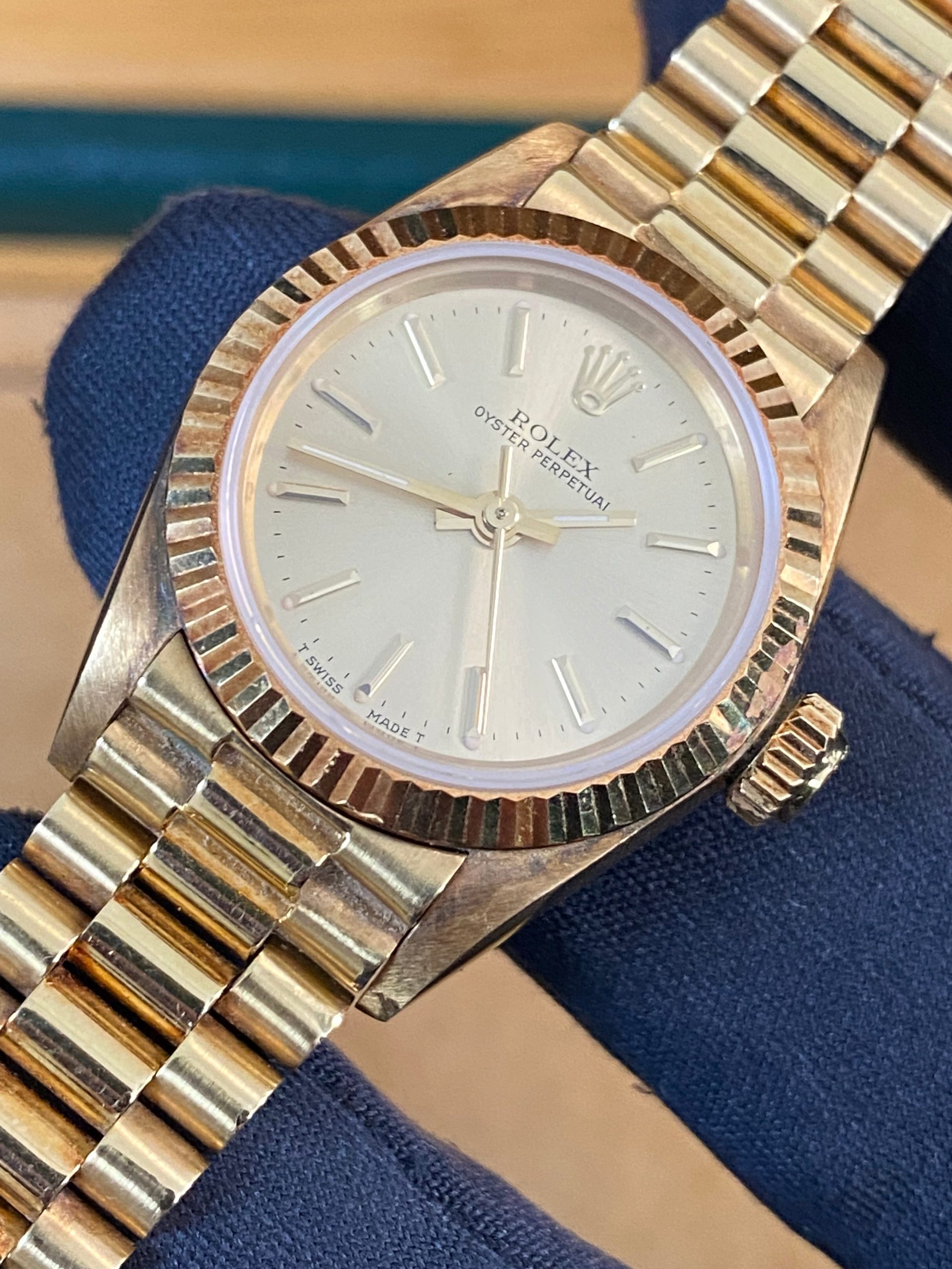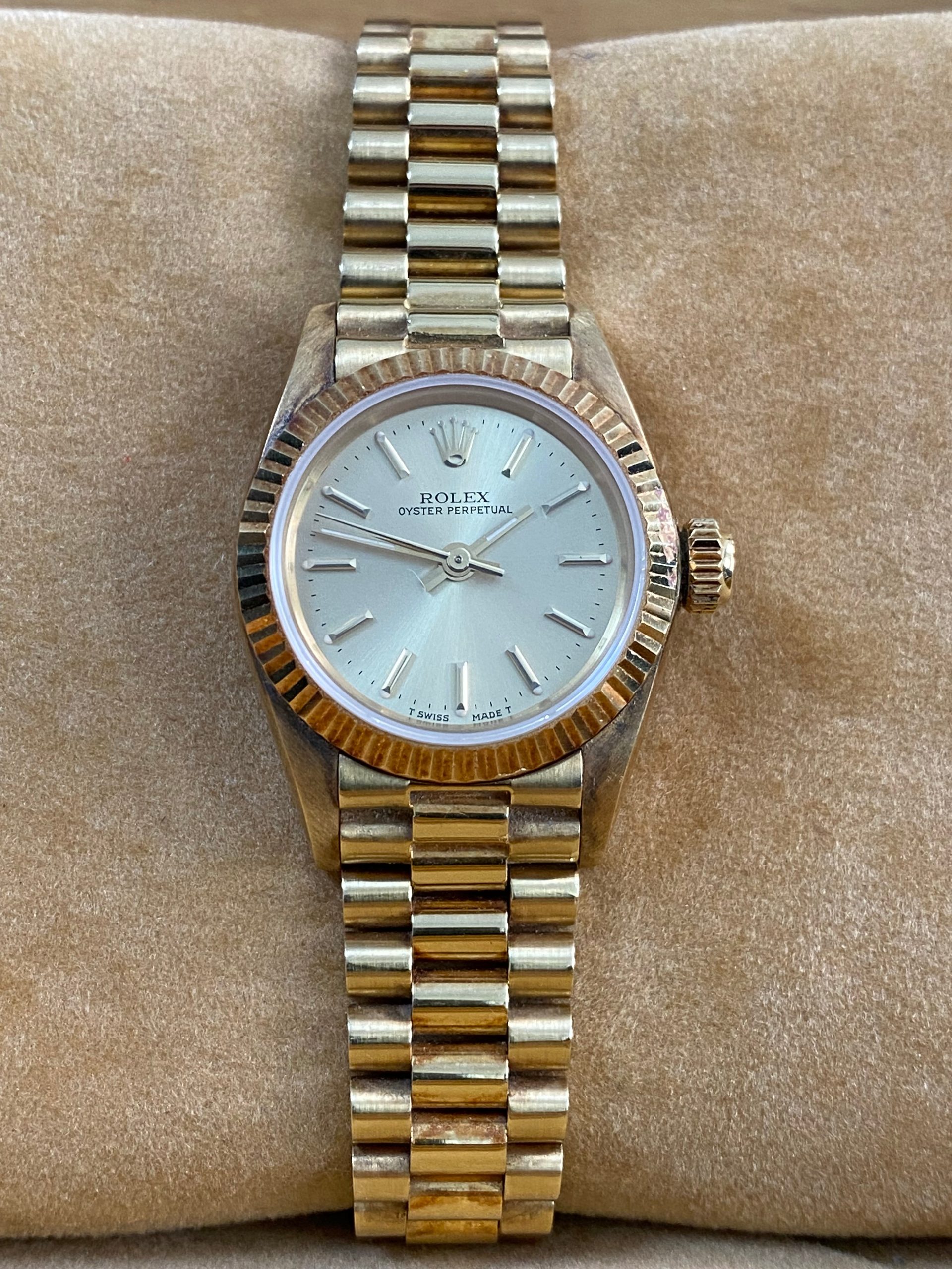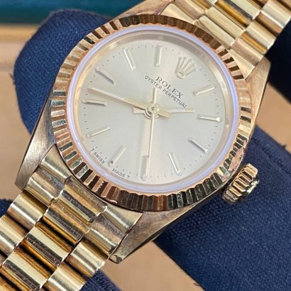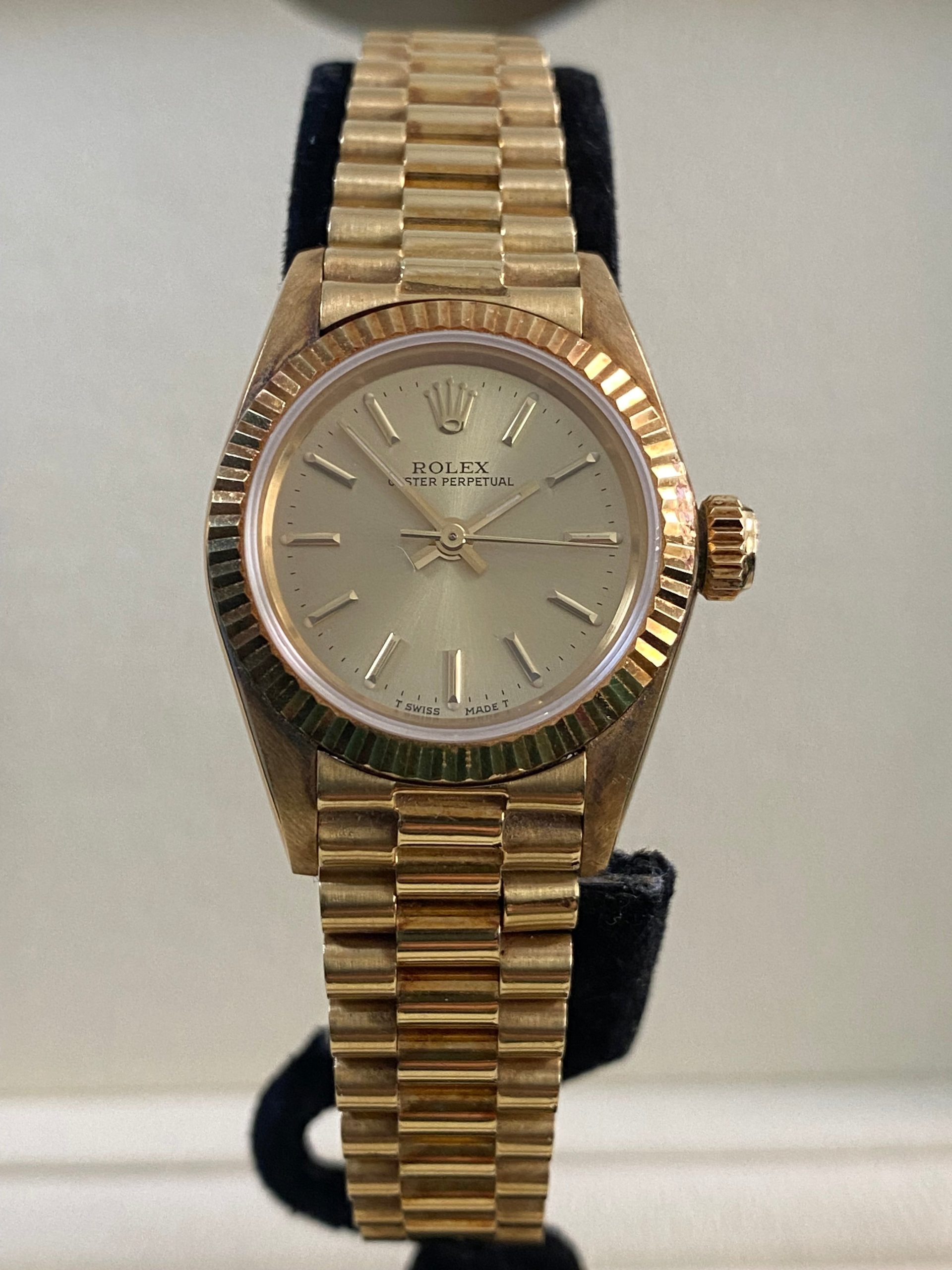 This watch is used but in mint condition, unpolished with intact caseback sticker, and will come with an original Rolex box when purchased. Considering its age, the president bracelet is in great shape with minimal signs of stretch as seen in the photo gallery. We provide a 1-year Warranty.